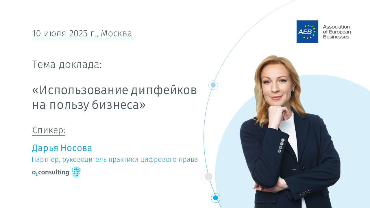 В рамках заседания с докладом на тему «Использование дипфейков на пользу бизнеса» выступит Дарья Носова, партнер, руководитель практики цифрового права и интеллектуальной собственности O2 Consulting.
