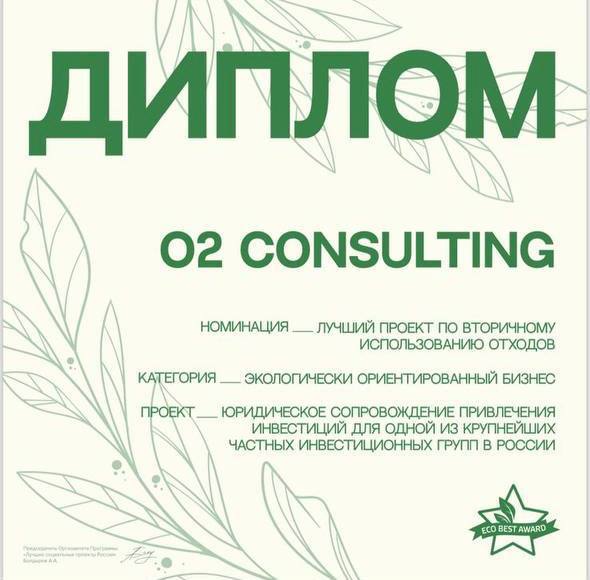 Рады сообщить, что O2 Consulting стала лауреатом 2025 года номинации «Лучший проект по вторичному использованию отходов» в категории «Экологически ориентированный бизнес» с проектом по юридическому сопровождению привлечения инвестиций для одной из крупнейших частных инвестиционных групп в России.