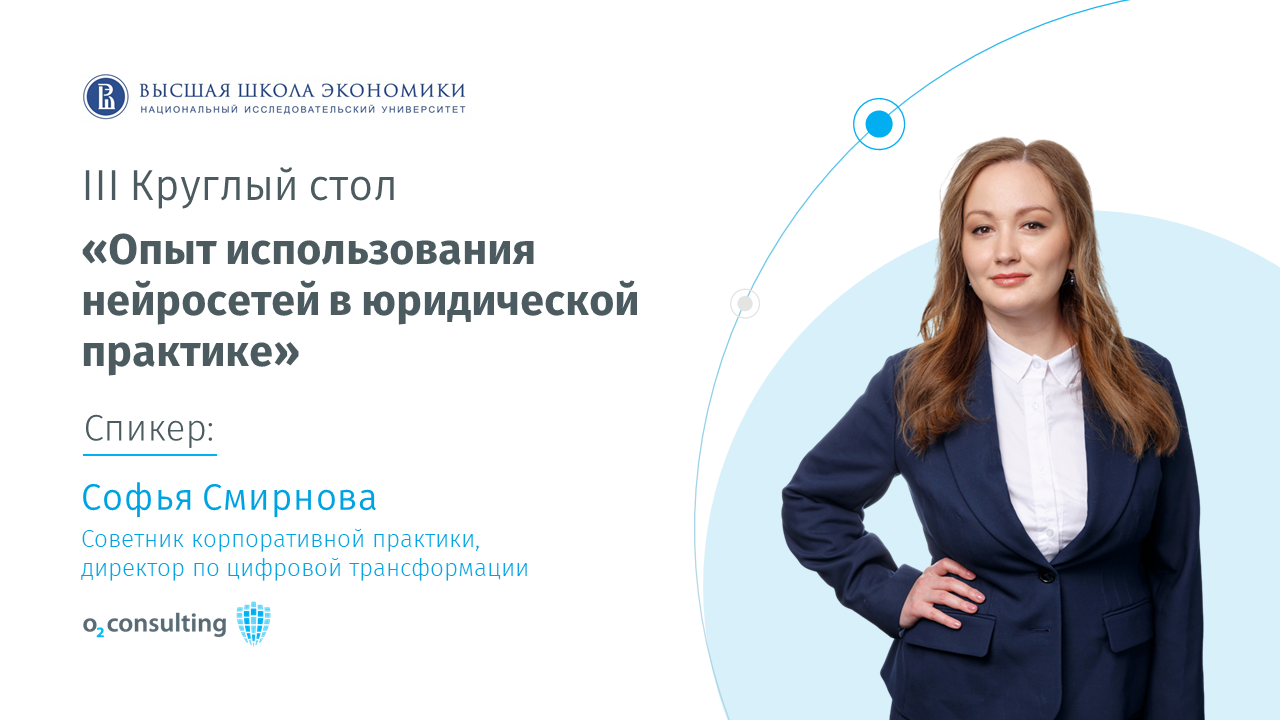 26 августа в рамках III Круглого стола «Опыт использования нейросетей в юридической практике» выступит Софья Смирнова, советник корпоративной практики, директор по цифровой трансформации O2 Consulting.
