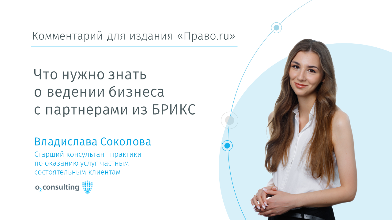 Владислава Соколова, старший консультант практики по оказанию услуг частным состоятельным клиентам O2 Consulting, обращает внимание на культурные особенности ведения дел в странах БРИКС. Подробнее — в материале Право.ru.